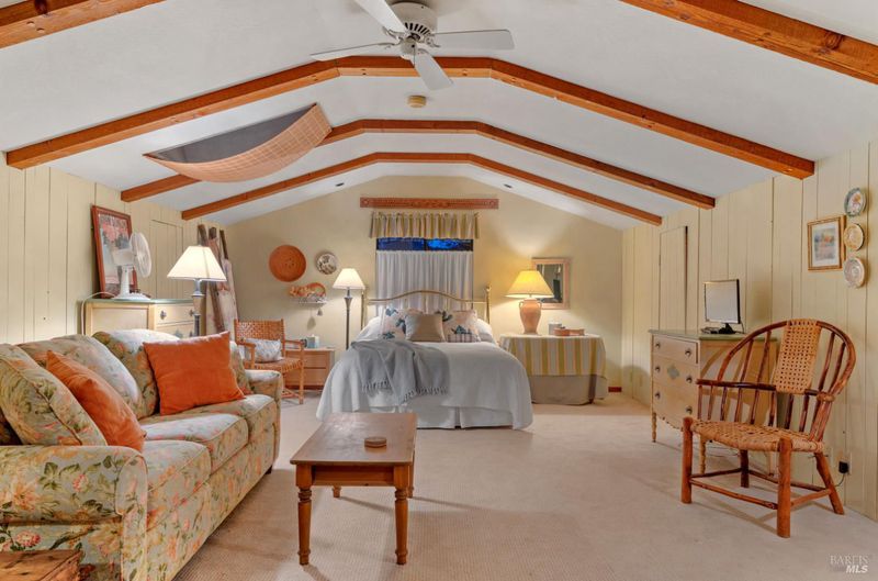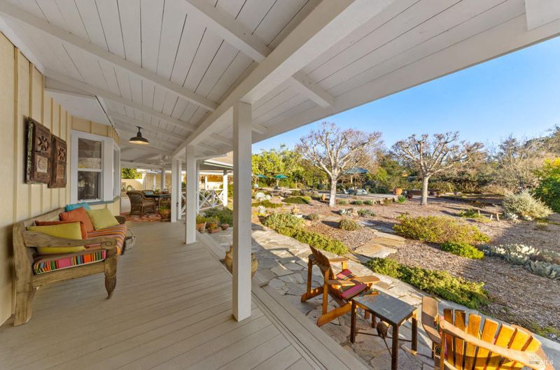 On Sonoma's coveted Castle Road, this enchanting home gracefully combines elegance with warmth. This modern farmhouse is just one block from the historic Bartholomew Park. The Park is home to a historic winery, museum, picnic sites, and scenic hiking trails. Upon entering the gated property, there's a spacious front porch, inviting you to sit awhile and enjoy the beauty. When you're ready, stroll inside to a welcoming foyer. The living room and dining area flows effortlessly into a well-appointed kitchen, ideal for both entertaining and everyday living. The recent addition of a ground-floor primary suite enhances its allure, providing a serene retreat. Also on the ground floor is a home office with a large closet. A bay window to the front garden makes working here a pleasure. The hallway includes a full bath, pantry cupboard and utility closet. Upstairs, you'll find a second primary suite with a large bathroom and closet. The mezzanine provides a cozy reading area with French doors to a balcony with a spectacular view. Step outside to discover a haven of leisure and creativity. The solar heated lap pool, about 50' x 10' with an attached spa, invites relaxation, while the detached barn serves as a workshop and art studio, catering to both the practical and the artistic soul. This 2-story barn features an additional studio space upstairs with a bathroom. Refrigerated wine storage off the detached garage, safely stores your wines. For those with a green thumb, the vegetable and flower garden offer a space to cultivate and enjoy nature's bounty. There's even a small henhouse for those who would enjoy keeping a few chickens. The home's lot provides ample space for outdoor enjoyment. The charming porches and balcony extend the living space, perfect for savoring the tranquil setting.