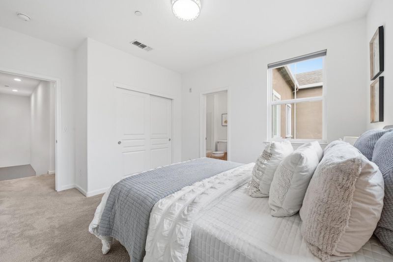 Gorgeous, move-in ready townhouse steps from Newhall Park and walking distance to Santa Clara University! Tucked away from the main street for maximum privacy, this bright, quiet unit is in one of the community's best locations and offers ample nearby guest parking. It features a fresh interior paint, and newly upgraded modern light fixtures throughout. The main level features high ceilings, recessed lighting, central AC and a convenient powder room. The chefs kitchen is appointed with stain-grade maple cabinetry, granite countertops, a pantry, and premium appliances. Upstairs, enjoy two spacious primary suites, one has a walk-in closet, dual sinks, and a separate soaking tub. The ground level offers a versatile den/office and an indoor laundry room equipped with a new Samsung washer and dryer. The attached 2-car side by side garage with a 220V Level 2 EV charging outlet. Outside, enjoy a private front patio perfect for grilling and gardening. Incredible location with low HOA fees that include water! Less than 1 mile to Caltrain and minutes from SJC, PayPal Park, SAP Center, Valley Fair, and Santana Row. Easy access to 880/87/101 and major tech hubs. Enjoy the best of San Jose living with uncrowded parks and dining just outside your door!