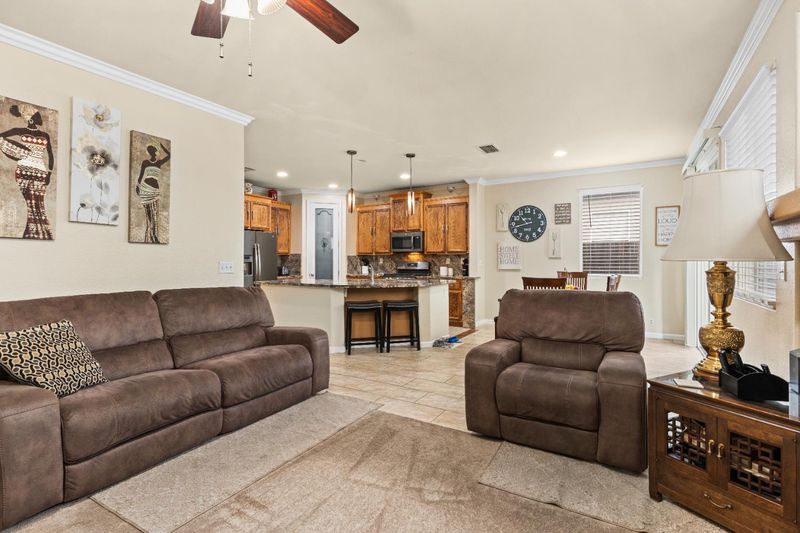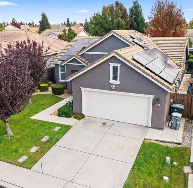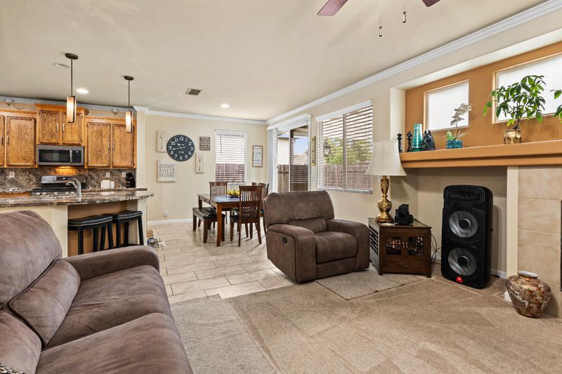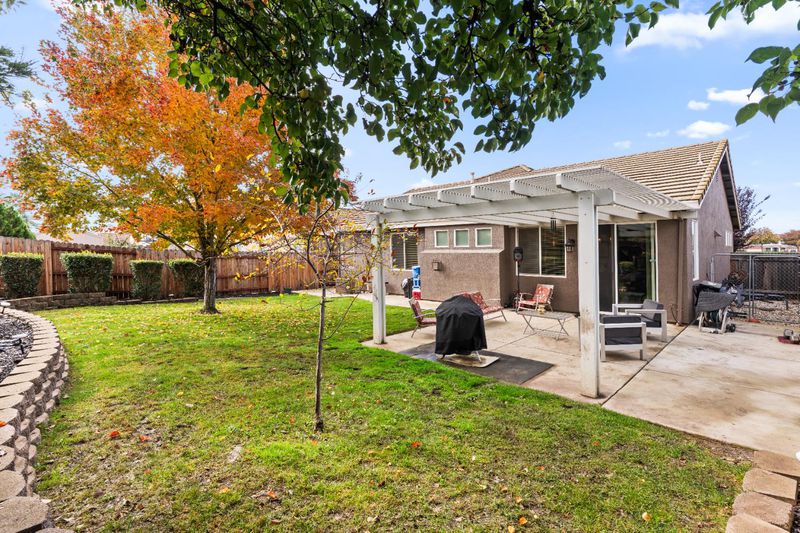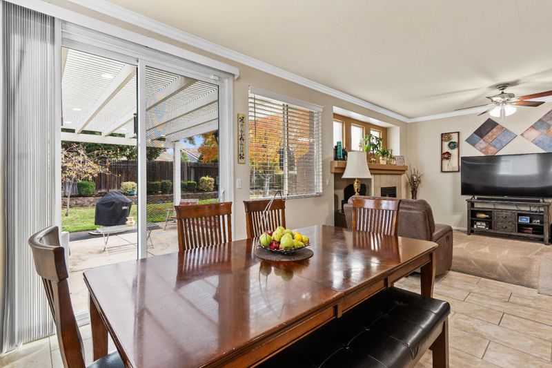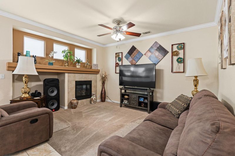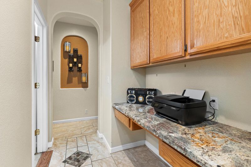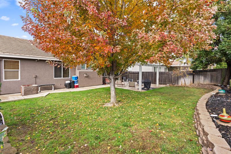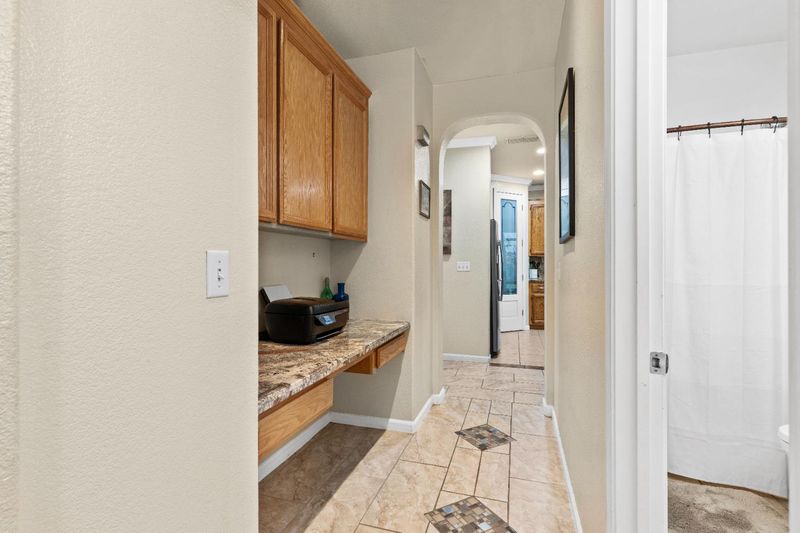 Welcome to this well maintained single-story home in a park-like setting. A landscaped front yard and views of the park directly across the street create a warm first impression. Inside, your greeted with a versatile open office/den that offers a flexible space for work or relaxation. The kitchen-dining ensemble features granite counters, ample cabinetry, and premium appliances, flowing into a cozy living room with carpet, built-in shelving, and a gas fireplace creating a comfortable space to gather and unwind. Custom design tile flooring extends through the kitchen and hallway, which includes a built-in desk, extra cabinets, and a guest bathroom. The private bedroom wing hosts a spacious primary suite with generous closets and an en-suite separate bath/shower with dual sinks. Across the hall are two additional bedrooms leading to a dedicated indoor laundry room with direct access to the garage. Outdoor living is a highlight. The backyard shines with stamped concrete, a large covered patio, lush lawn, newer fencing, and a custom retaining wall ideal for relaxing or entertaining. Energy-efficient home with a solar lease, this move-in-ready home offers comfort, convenience, and pride of ownership.