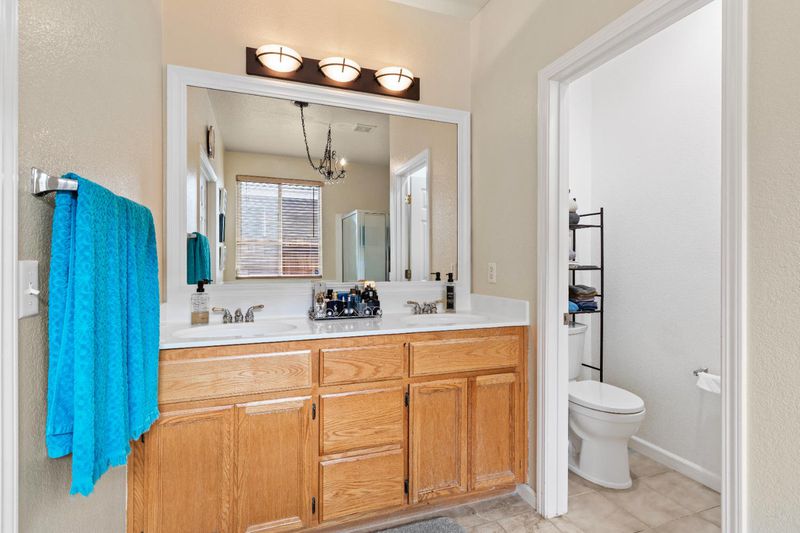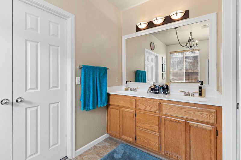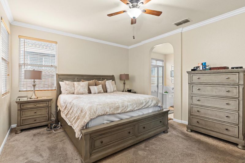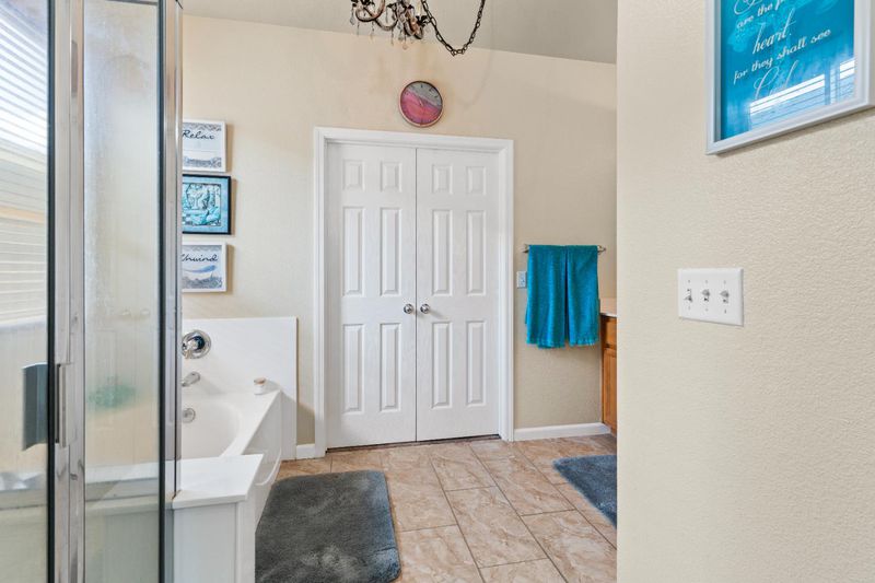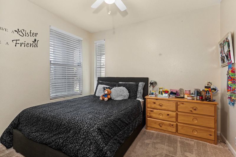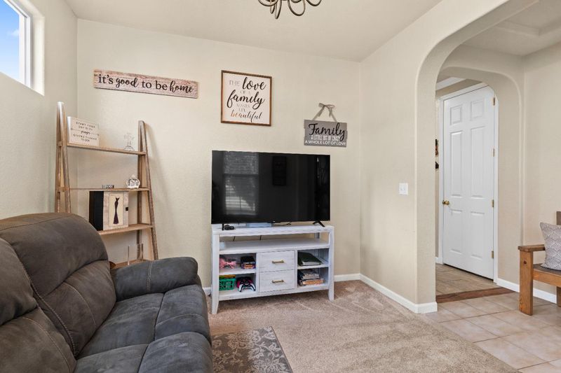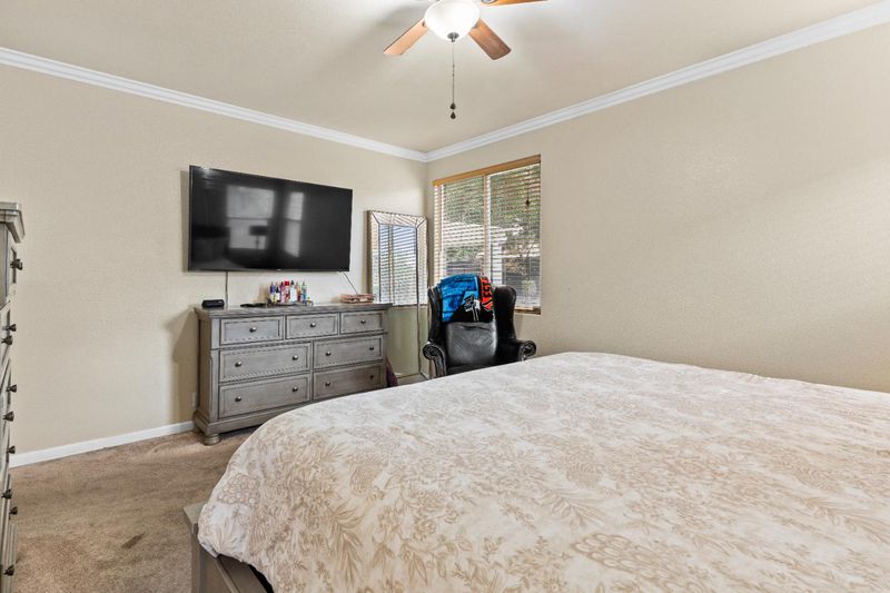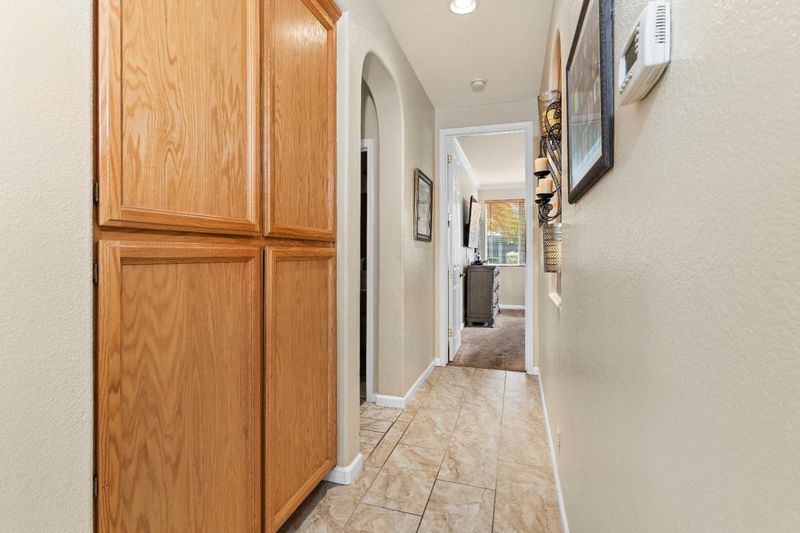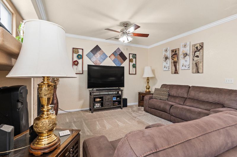 Welcome to this well maintained single-story home in a park-like setting. A landscaped front yard and views of the park directly across the street create a warm first impression. Inside, your greeted with a versatile open office/den that offers a flexible space for work or relaxation. The kitchen-dining ensemble features granite counters, ample cabinetry, and premium appliances, flowing into a cozy living room with carpet, built-in shelving, and a gas fireplace creating a comfortable space to gather and unwind. Custom design tile flooring extends through the kitchen and hallway, which includes a built-in desk, extra cabinets, and a guest bathroom. The private bedroom wing hosts a spacious primary suite with generous closets and an en-suite separate bath/shower with dual sinks. Across the hall are two additional bedrooms leading to a dedicated indoor laundry room with direct access to the garage. Outdoor living is a highlight. The backyard shines with stamped concrete, a large covered patio, lush lawn, newer fencing, and a custom retaining wall ideal for relaxing or entertaining. Energy-efficient home with a solar lease, this move-in-ready home offers comfort, convenience, and pride of ownership.