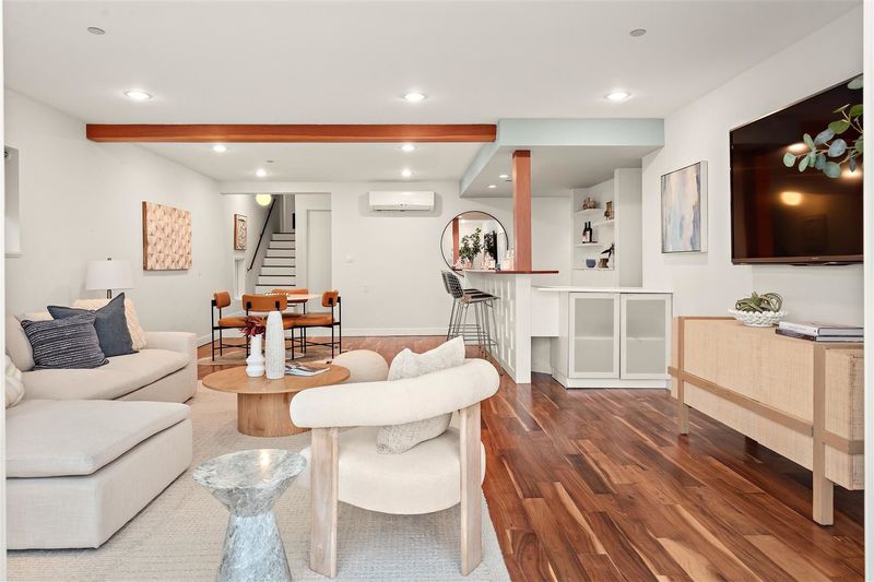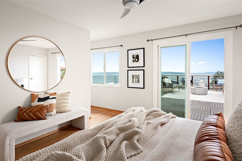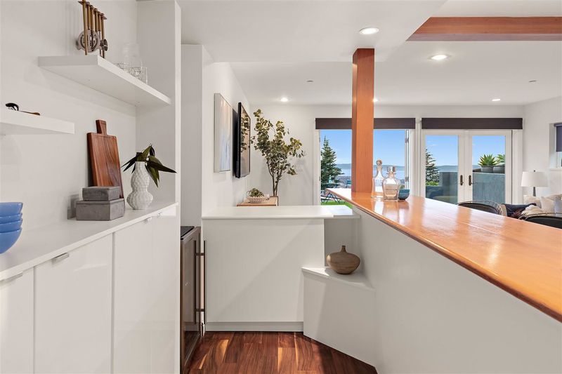 Cool mid-century home, updated and transformed into an entertainer's dream, with fabulous interior flow and a design that seamlessly ties indoor and outdoor spaces together. Multiple glass doors welcome uninterrupted views of the bay and beyond into the primary bedroom, living/dining room and family room. This home is all about the lifestyle, from its large and level garden terraces to the huge roof deck, and from the hot tub to the expansive family room including a built-in bar. The living/dining room shows off glorious views as well as a fireplace set in a wall of travertine to keep things cozy on cold days. The kitchen and bathrooms have all been tastefully updated with modern amenities, with walls clad in tile that is contemporary but blends comfortably with the home's mid-century vibe. All three bedrooms sit a few steps up from the primary entertaining areas, setting them apart and creating a sense of privacy. The two secondary bedrooms look out upon a length of undeveloped parkland area. This is a special place, beautifully situated near everything yet far enough to feel calm.