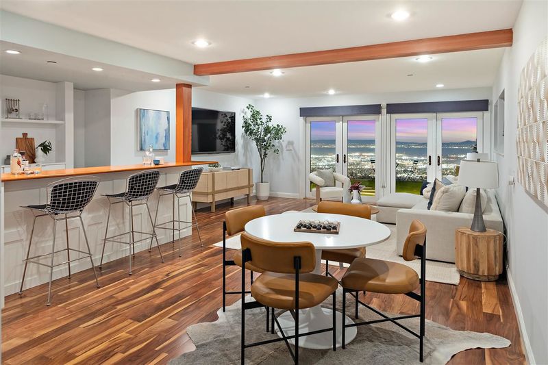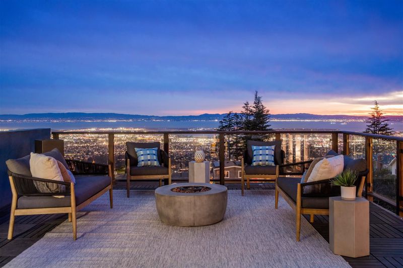 Cool mid-century home, updated and transformed into an entertainer's dream with a living/dining room, massive family room (with built-in bar) and primary bedroom suite which all open to uninterrupted bay vistas from the Bay Bridge to San Mateo Bridge, downtown SF, Coit Tower, the peninsula, and twinkling East Bay lights at night. A huge deck, level terraced backyard with seating areas, and a hot tub promise relaxing days and evenings. Features an updated kitchen & bathrooms, full laundry room, and many other features. Sits blocks from Skyline Comm'ty Market, Oakland Hills Tennis Club and hiking trails, and just a 5 minute drive from highway 13.