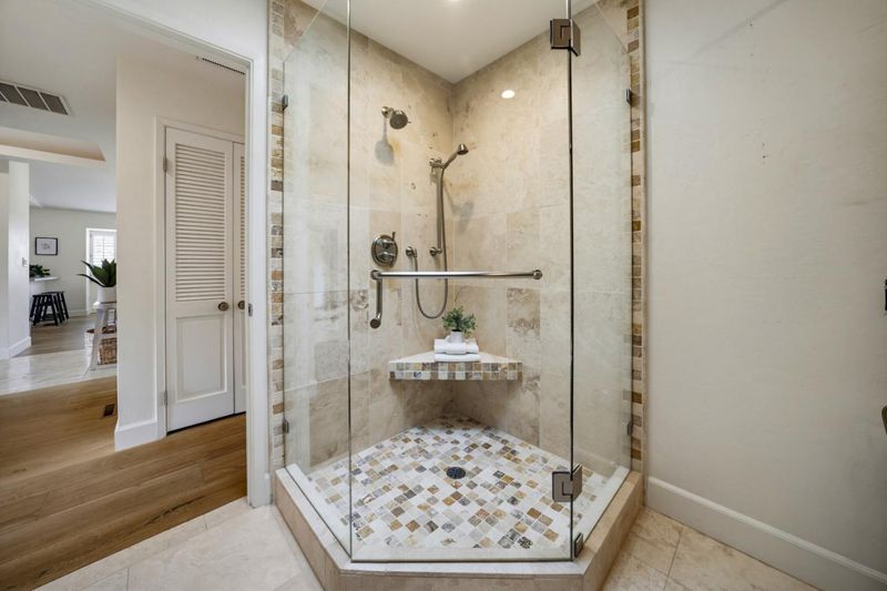 - Full on Ground Floor, Oversized Tub, Primary - Tub with Jets, Split Bath, Stall Shower, Stall Shower - 2+, Stone, Tile, Tub in Primary Bedroom, Updated Bath